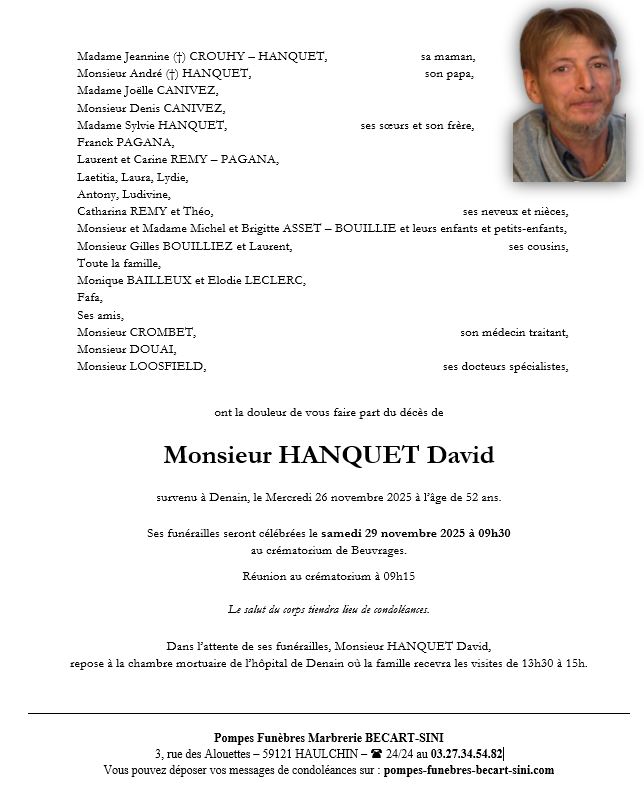 Cette page vous permet de présenter vos condoléances à la famille et de partager l'avis de décès de David.